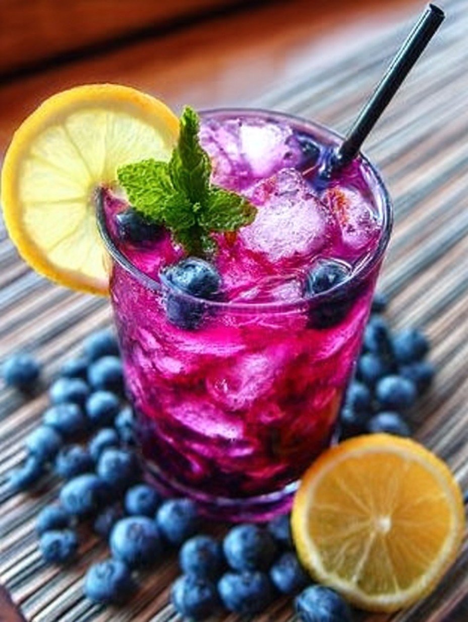 What makes this drink even better is its versatility. You can serve it as a non-alcoholic treat for kids or jazz it up for adults with a splash of your favorite spirit. Plus, it’s packed with vitamins from the fruit, making it almost healthy—well, at least healthier than soda! And let’s not forget how stunning it looks; those deep blue hues against the bright yellow juice are sure to impress your guests.
