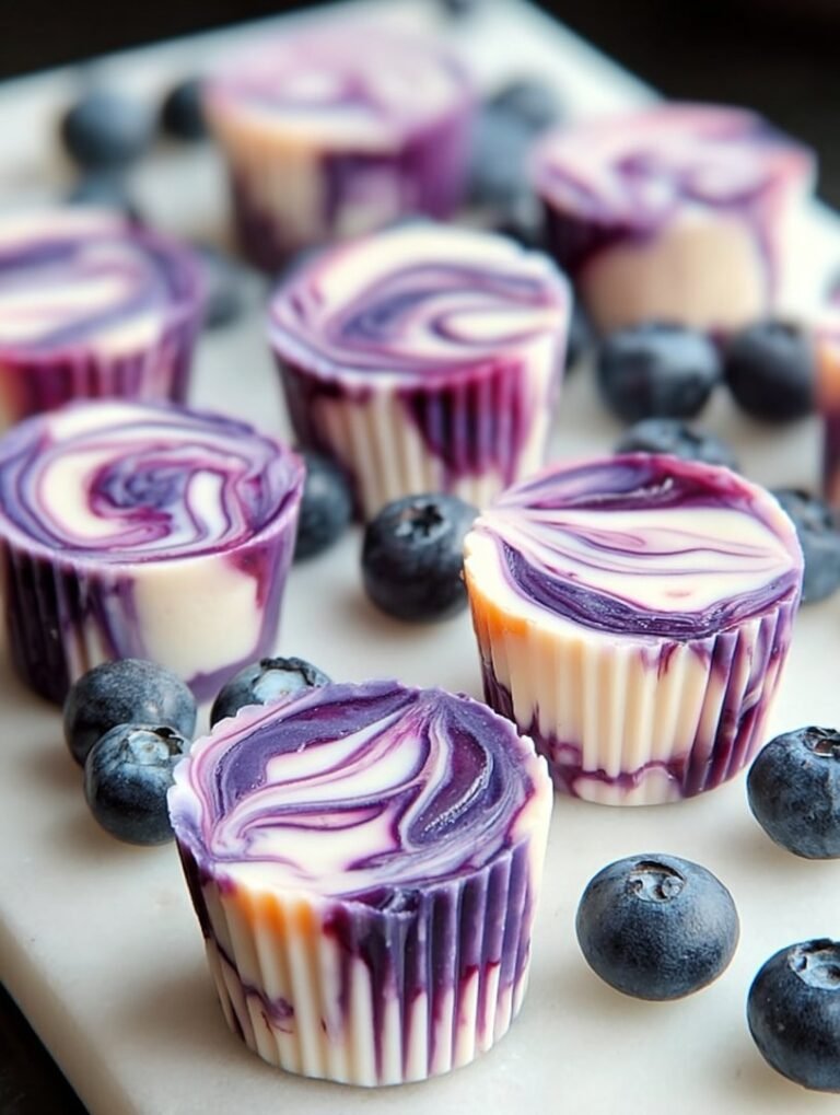 - Stunning purple swirls against creamy white yogurt make these bites look gourmet, yet they require zero artistic talent to perfect.