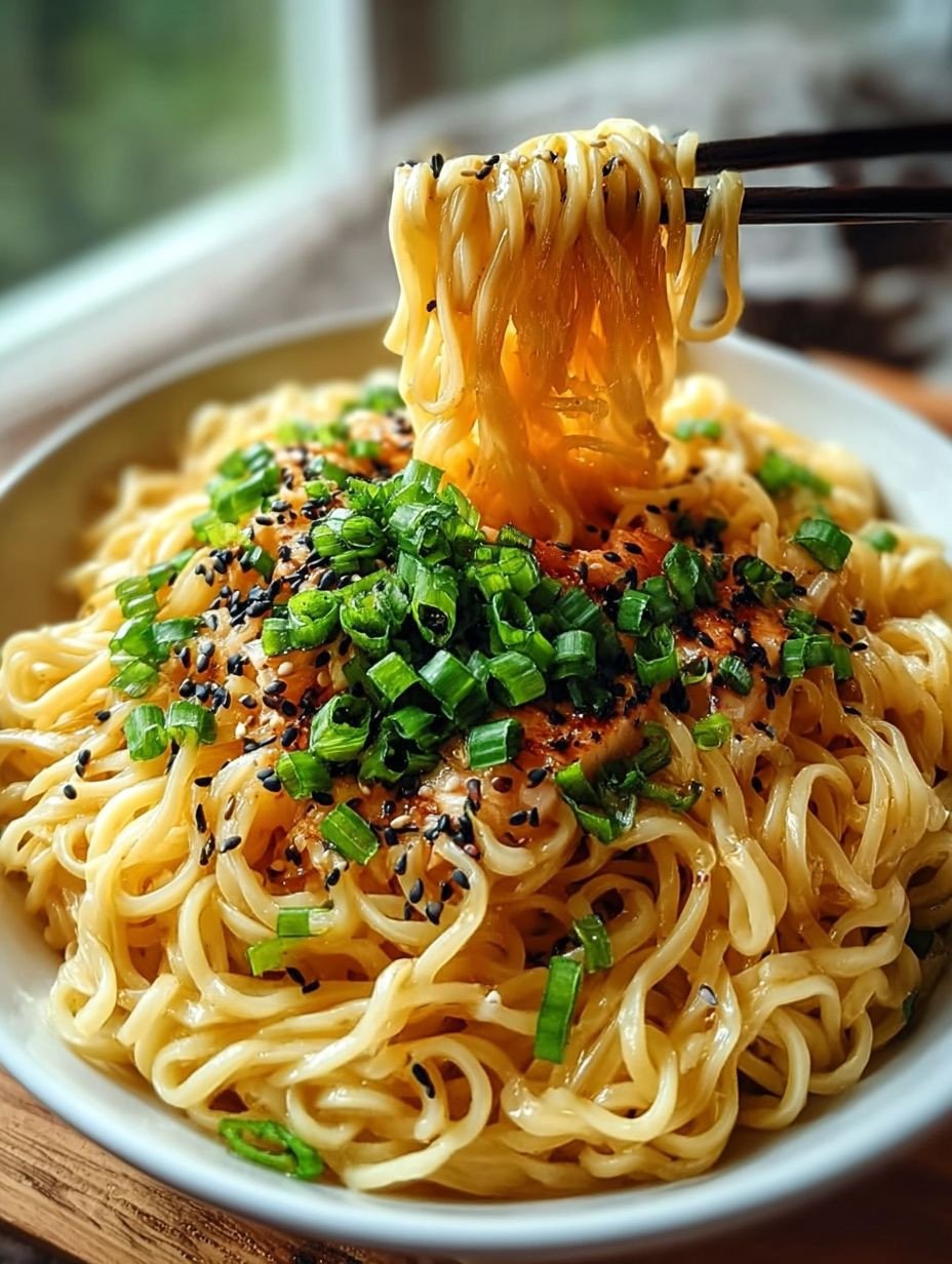 - Step 5: Serve the noodles in bowls, garnished with chopped green onion, toasted sesame seeds, and a sprinkle of chili flakes if desired. Enjoy!