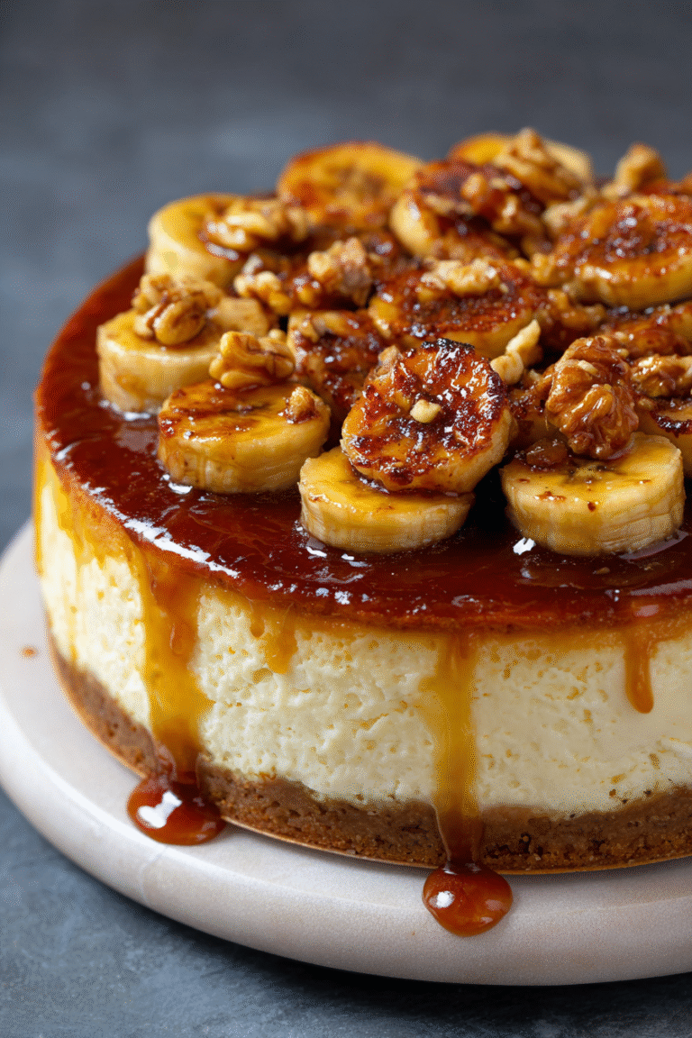 First, prepare the cheesecake base and bake it until golden. While that cools, caramelize the bananas slowly to develop deep flavor. Next, whip the cream cheese filling and gently fold in the caramelized bananas. Finally, pour the filling into the cooled crust and chill thoroughly before adding the glaze.