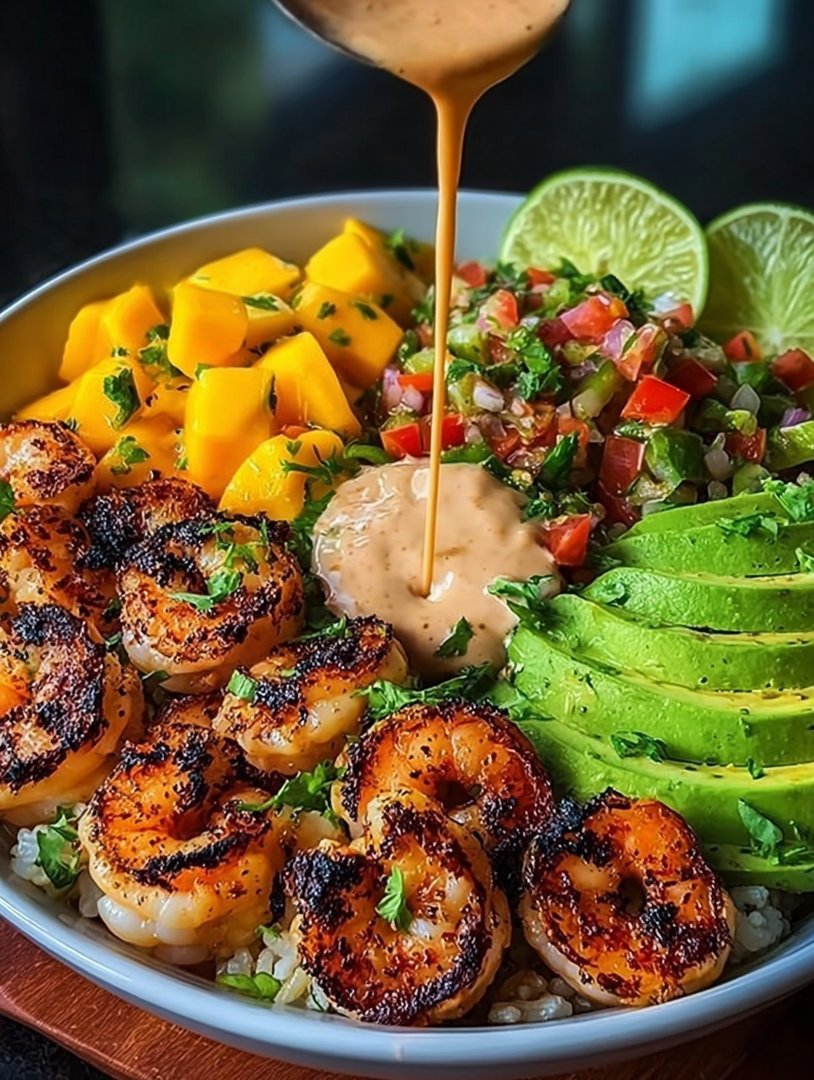 Shrimp and Avocado Bowls with Mango Salsa & Lime-Chili Sauce