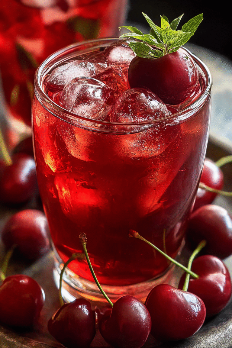 5. **Serve: ** Pour over ice and garnish with fresh cherries, mint sprigs, and lemon slices.
