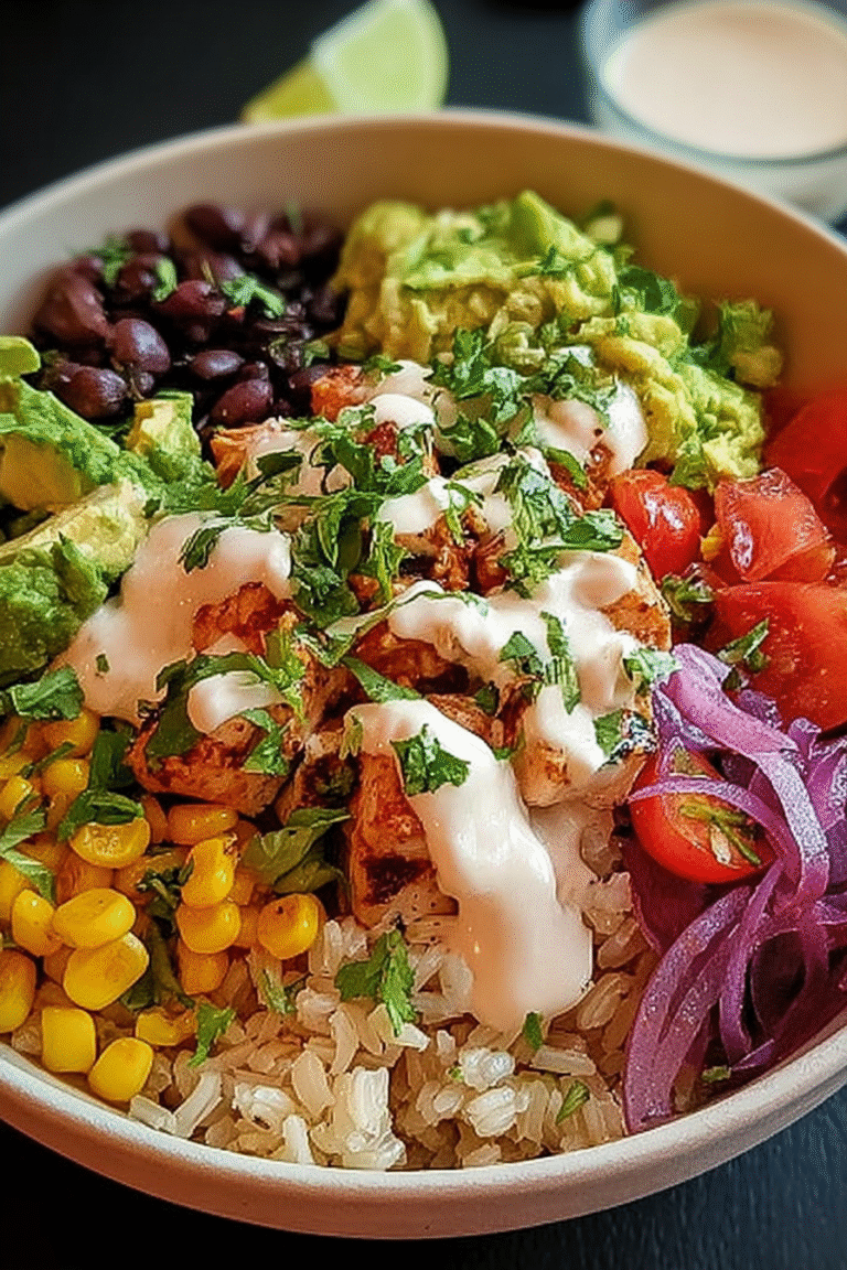 Delicious colorful burrito bowl recipe with detailed instructions and nutritional information.
