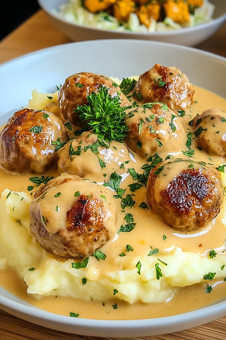 Once the meatballs are cooked, gently add them to the creamy sauce, ensuring they are fully coated. Serve the meatballs in their creamy sauce over a generous portion of fluffy mashed potatoes. Garnish with fresh parsley.