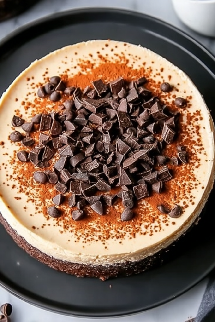 Transfer to a serving plate, slice, and garnish with chocolate shavings or a dusting of cocoa powder for the perfect finishing touch. This **Mocha Cheesecake** is best enjoyed chilled.