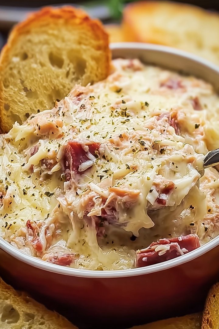 Dive in and enjoy the delicious flavors of your Slow Cooker Reuben Dip. This is an excellent dip for a party.